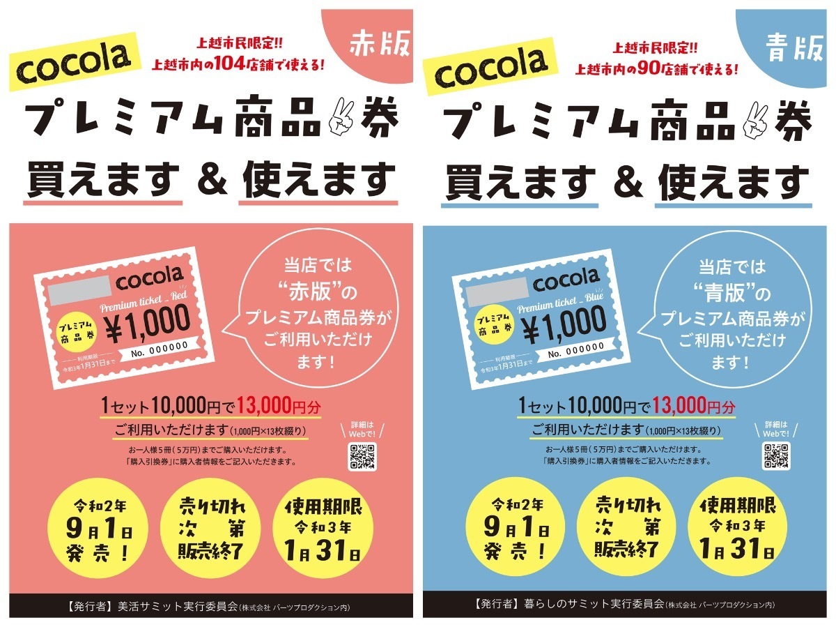 上越市プレミアム商品券 赤版・青版 取り扱い開始 2020年9月1日より上越市プレミアム商品券 赤版・青版の取り扱いを開始いたします。10,000円で13,000円ご利用いただけるとってもお得な商品券!上越市内にお住みの方限定になります。当店は、ごく少数の取扱店になっております。当店でご利用予定のあるお客様へ販売しております。プレミアム商品券大口での購入をご希望のお客様は特設会場でご購入ください。
